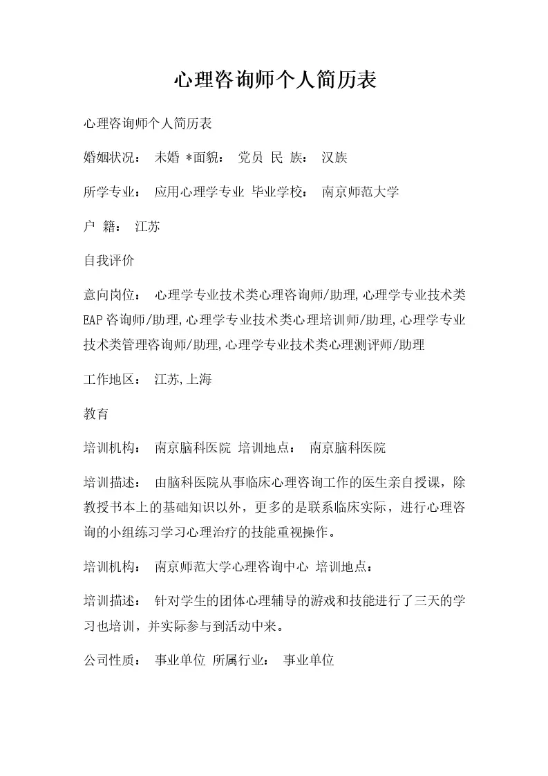 心理咨询师个人简历表