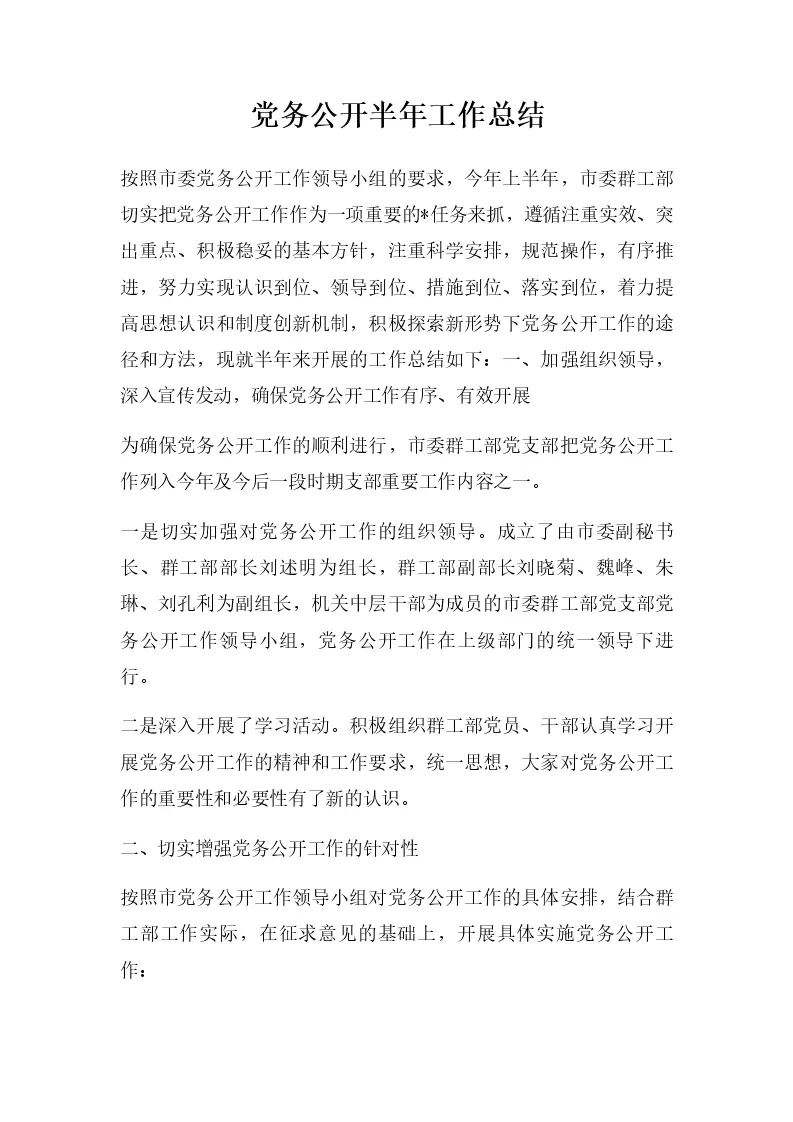 党务公开半年工作总结