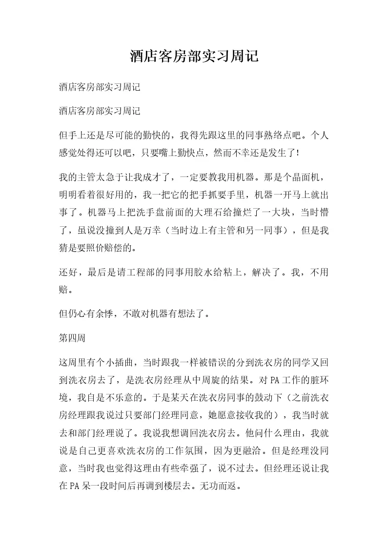 酒店客房部实习周记