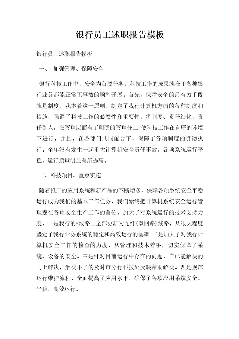 银行员工述职报告模板
