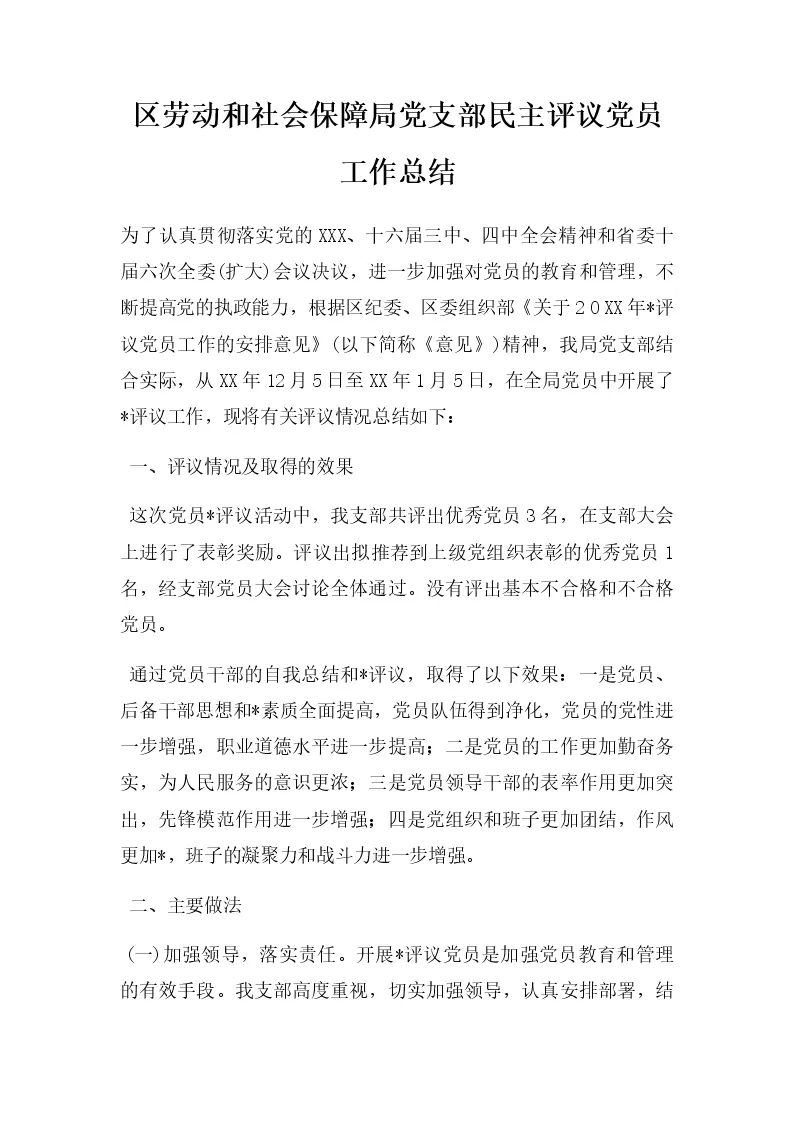 区劳动和社会保障局党支部民主评议党员工作总结