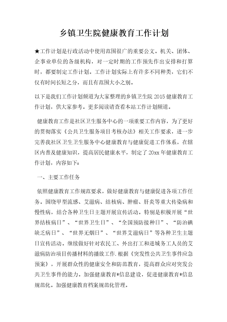 乡镇卫生院健康教育工作计划