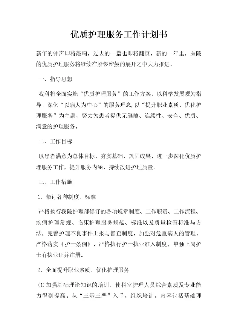优质护理服务工作计划书