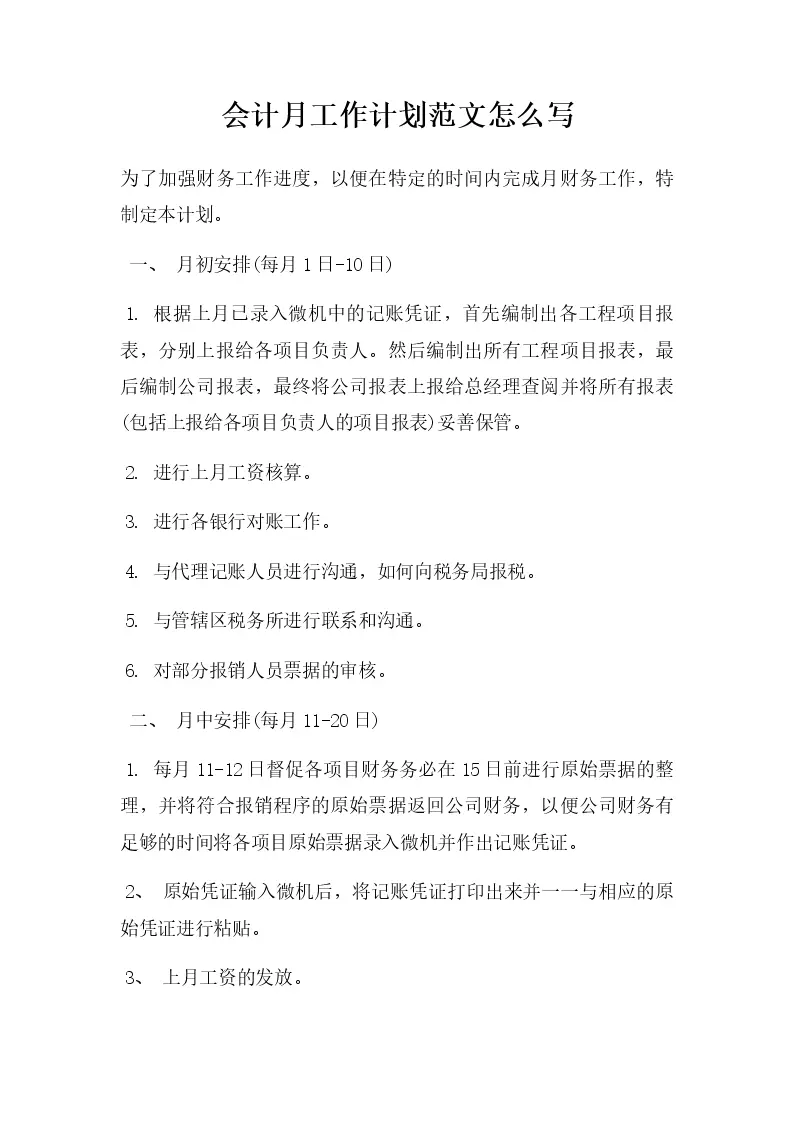 会计月工作计划范文怎么写