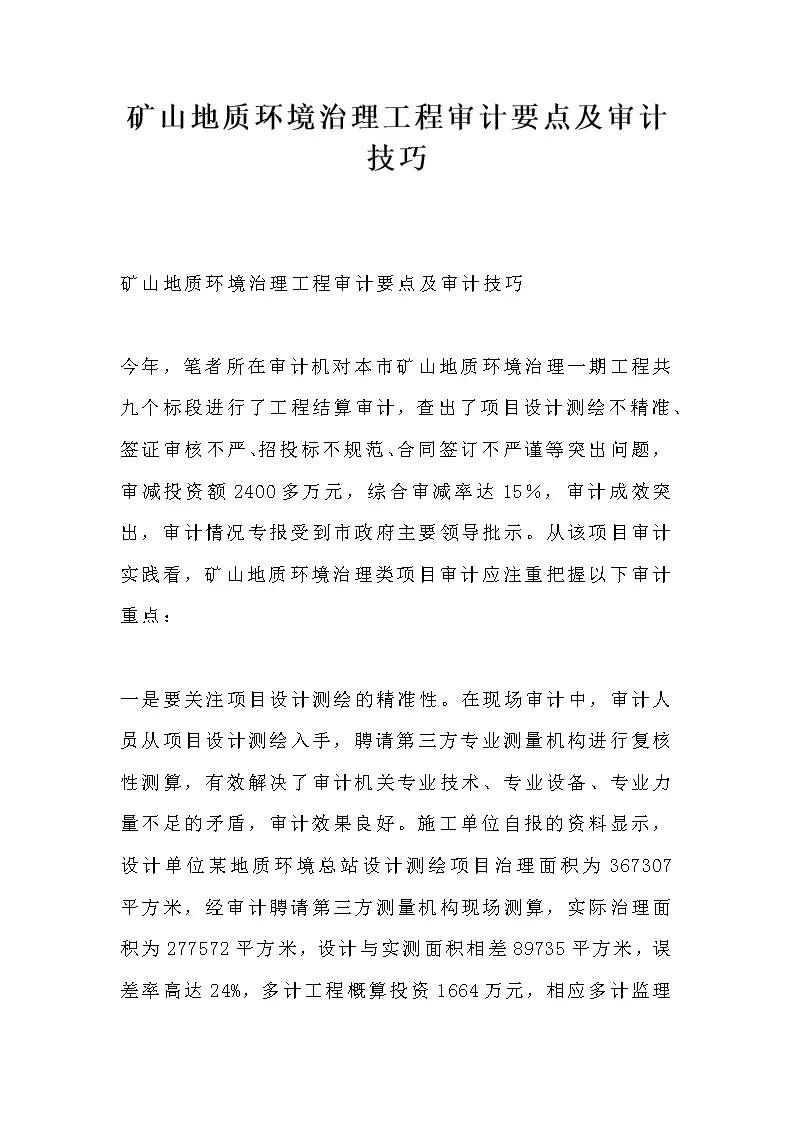 矿山地质环境治理工程审计要点及审计技巧