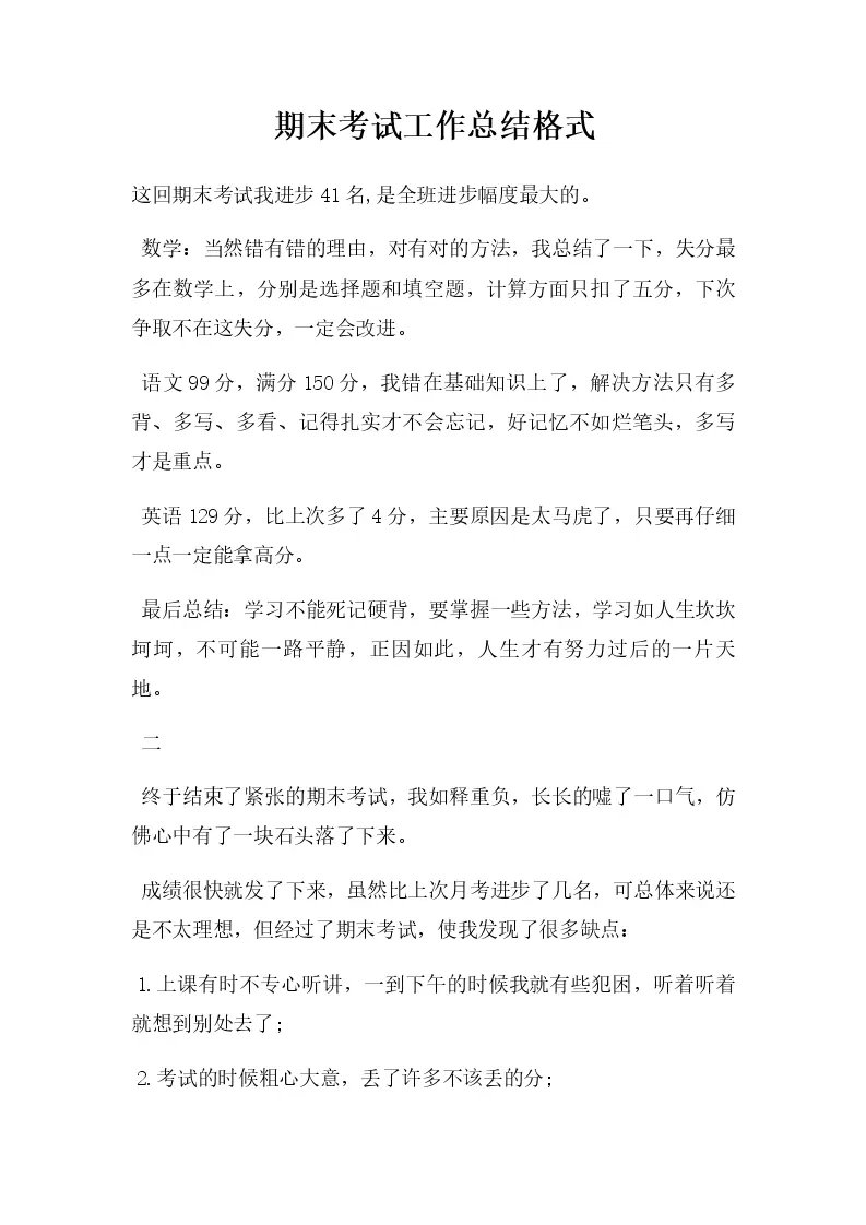 期末考试工作总结格式