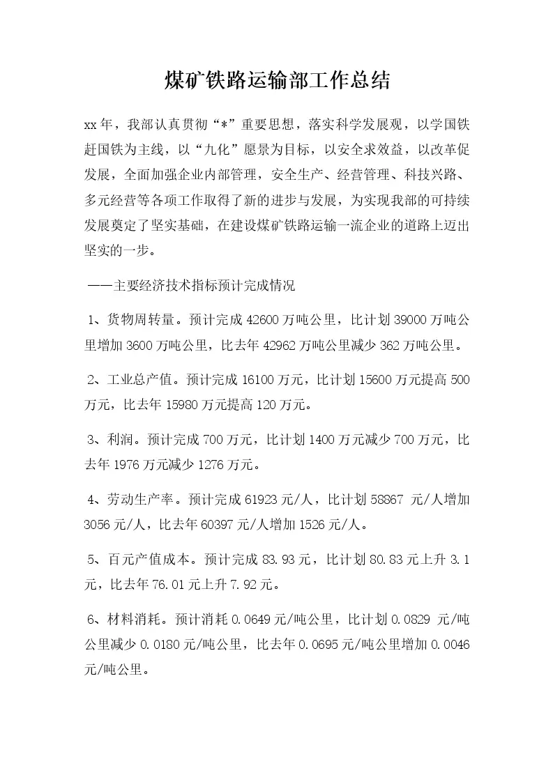 煤矿铁路运输部工作总结