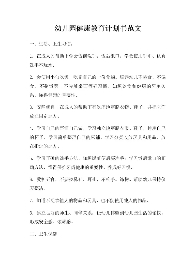 幼儿园健康教育计划书范文