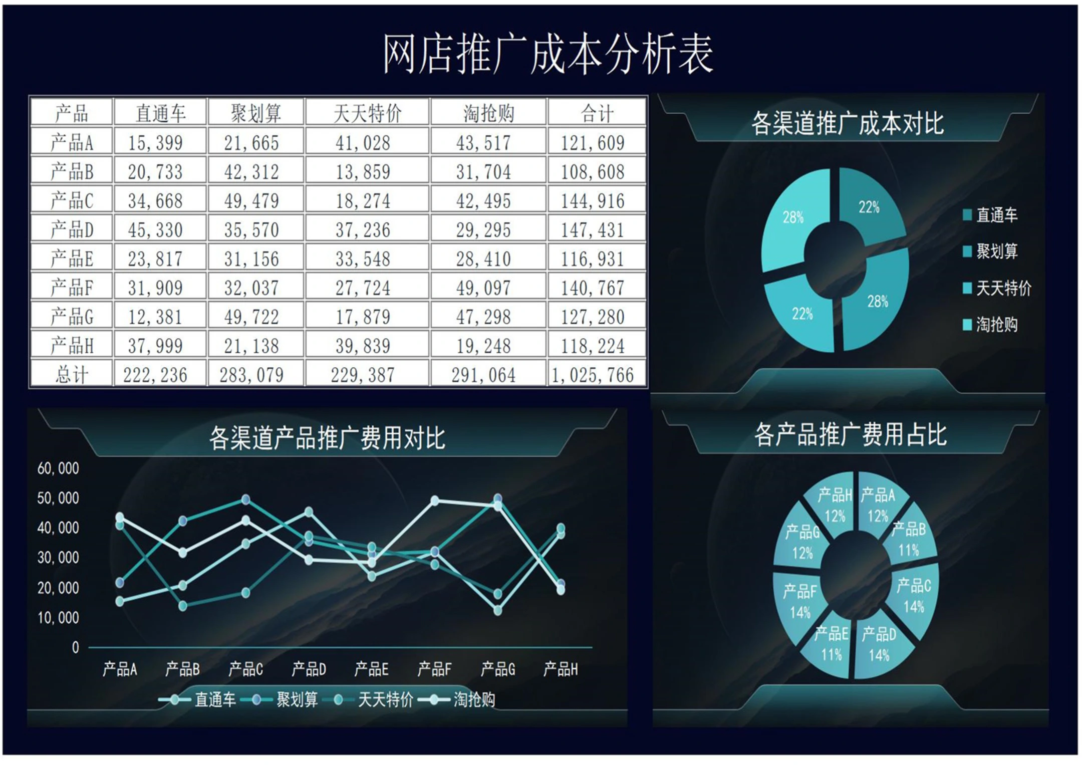 深色网店推广成本分析表Excel模板