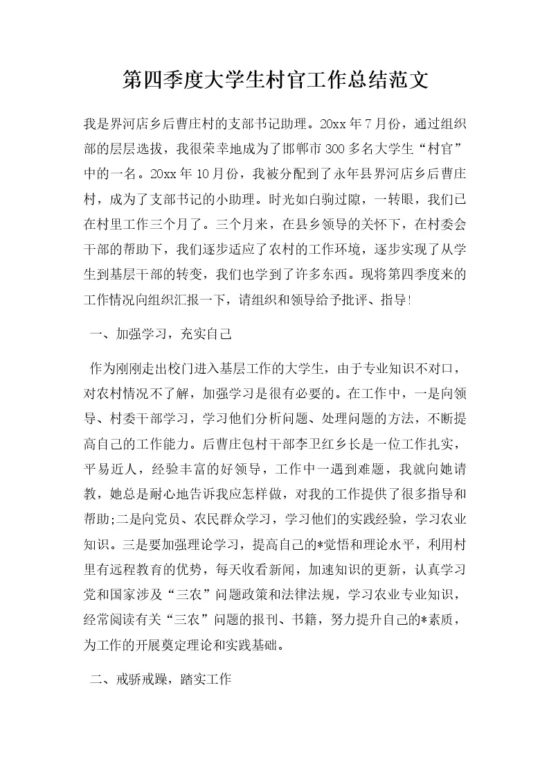 第四季度大学生村官工作总结范文