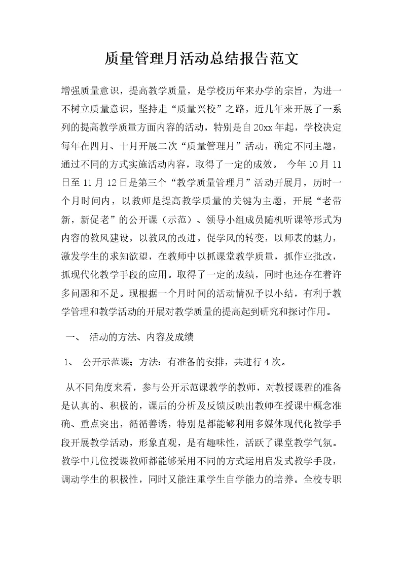 质量管理月活动总结报告范文