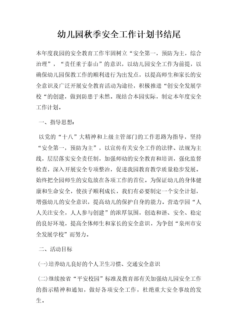 幼儿园秋季安全工作计划书结尾