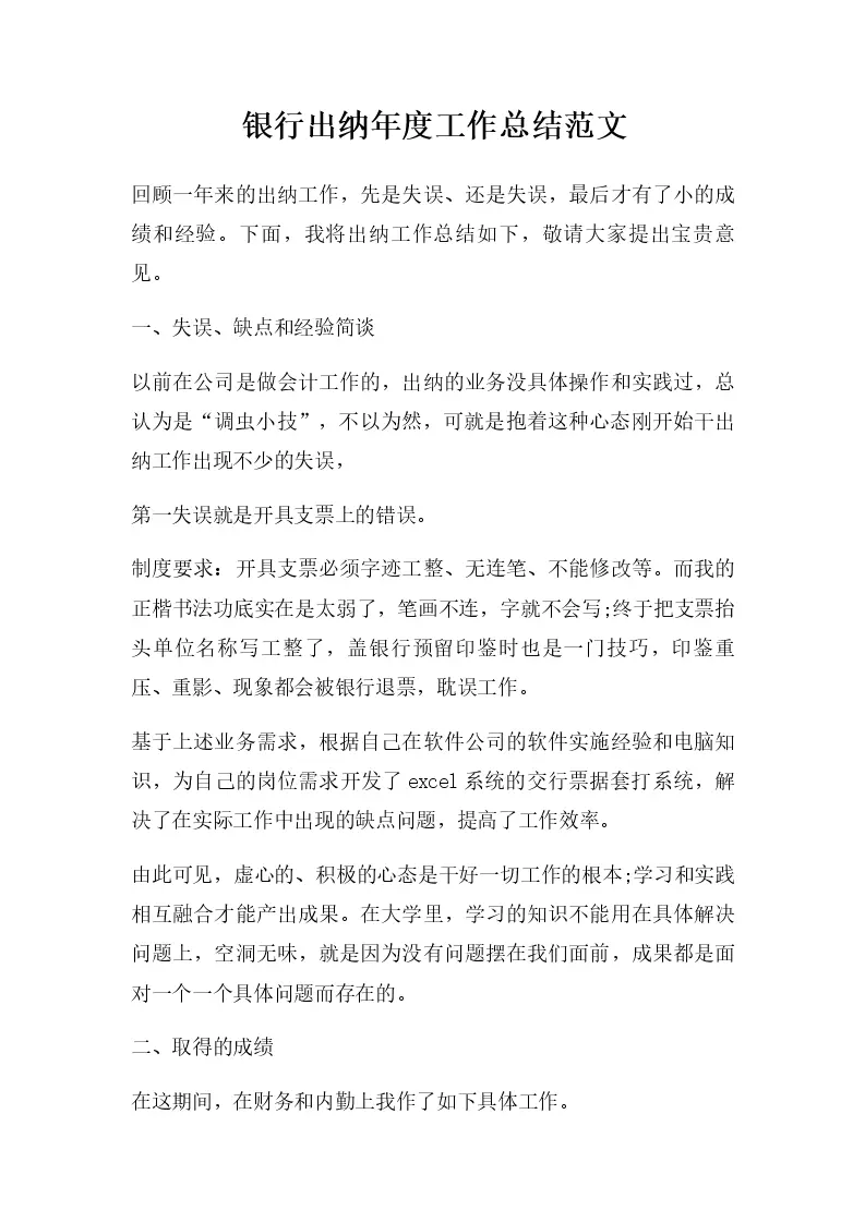 银行出纳年度工作总...