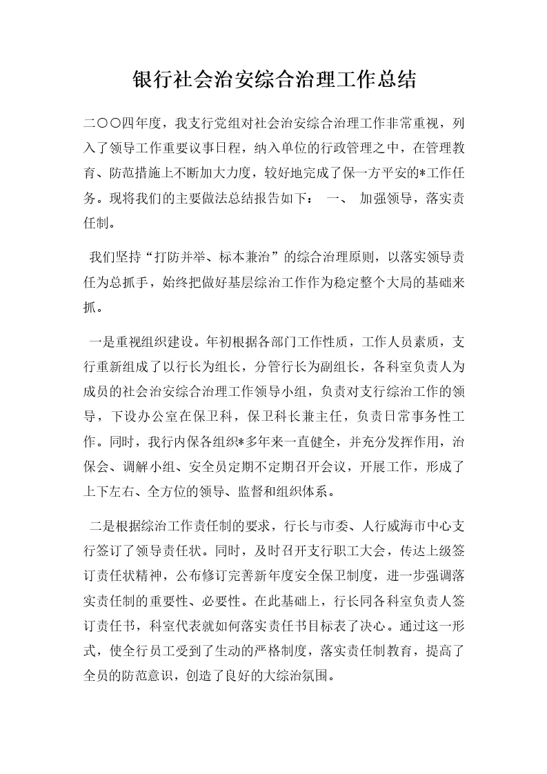 银行社会治安综合治理工作总结