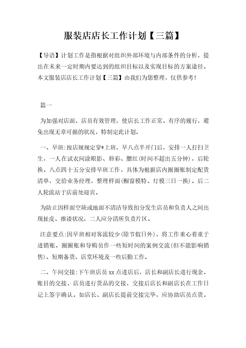 服装店店长工作计划【三篇】