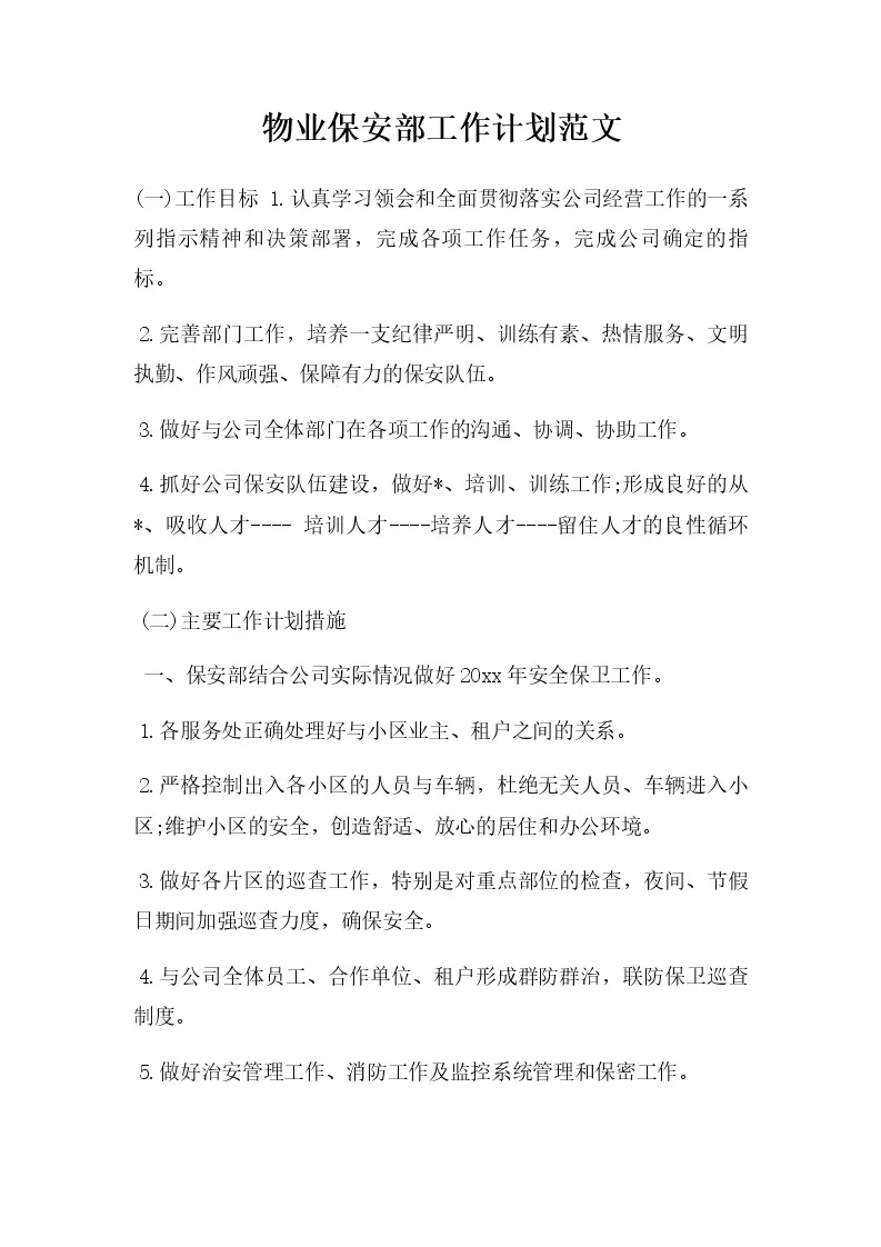 物业保安部工作计划范文