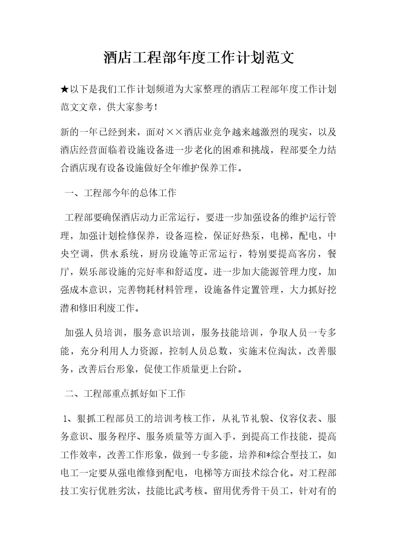酒店工程部年度工作计划范文