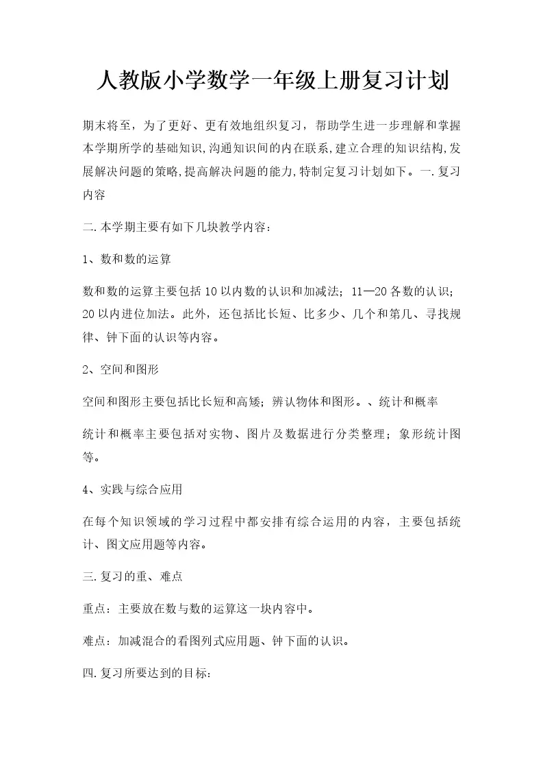 人教版小学数学一年级上册复习计划