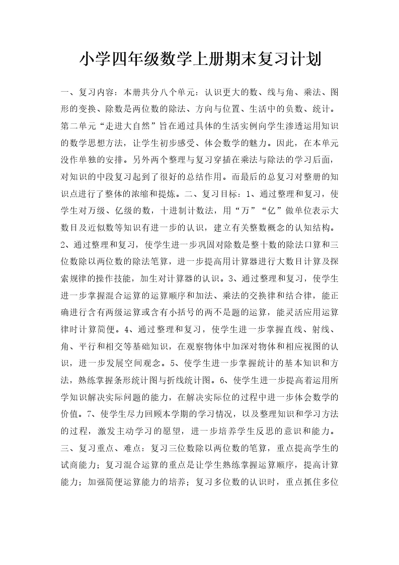 小学四年级数学上册期末复习计划