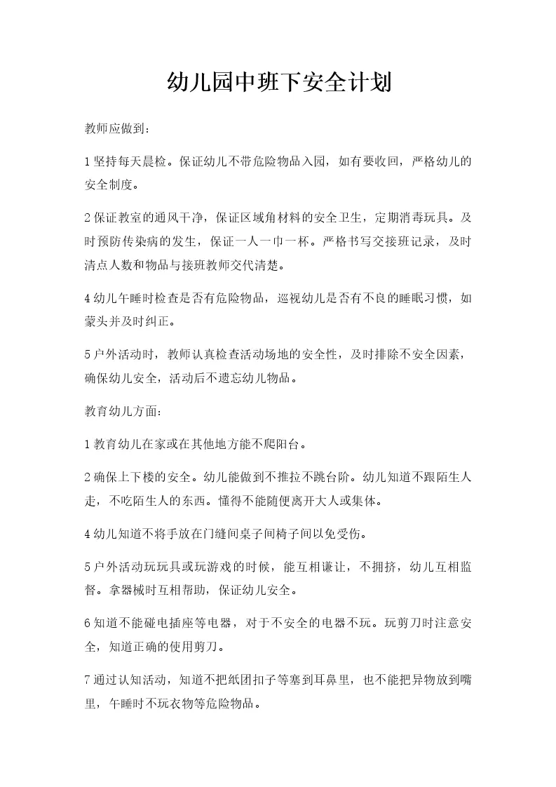 幼儿园中班下安全计划