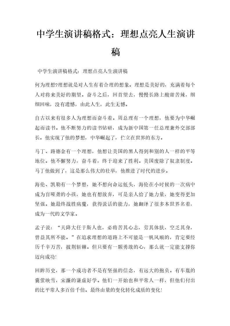 中学生演讲稿格式:理想点亮人生演讲稿