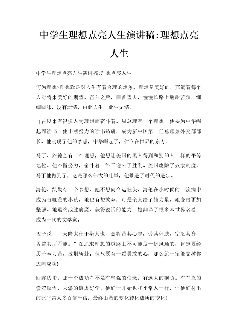 中学生理想点亮人生演讲稿理想点亮人生