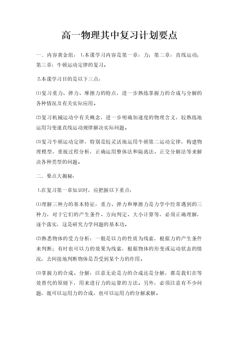 高一物理其中复习计划要点