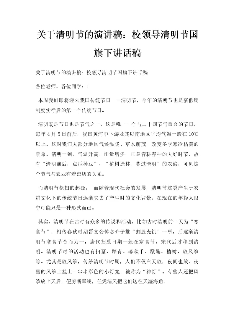 清明节的演讲稿:校领导清明节国旗下讲话稿