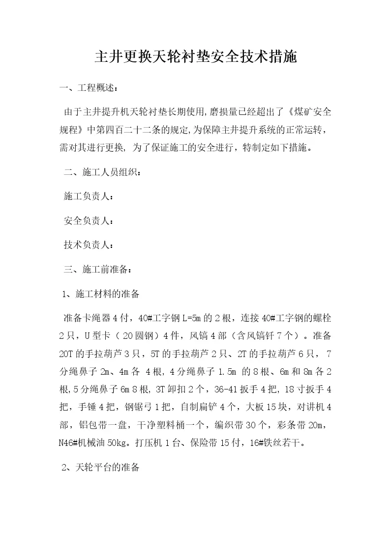 主井更换天轮衬垫安全技术措施