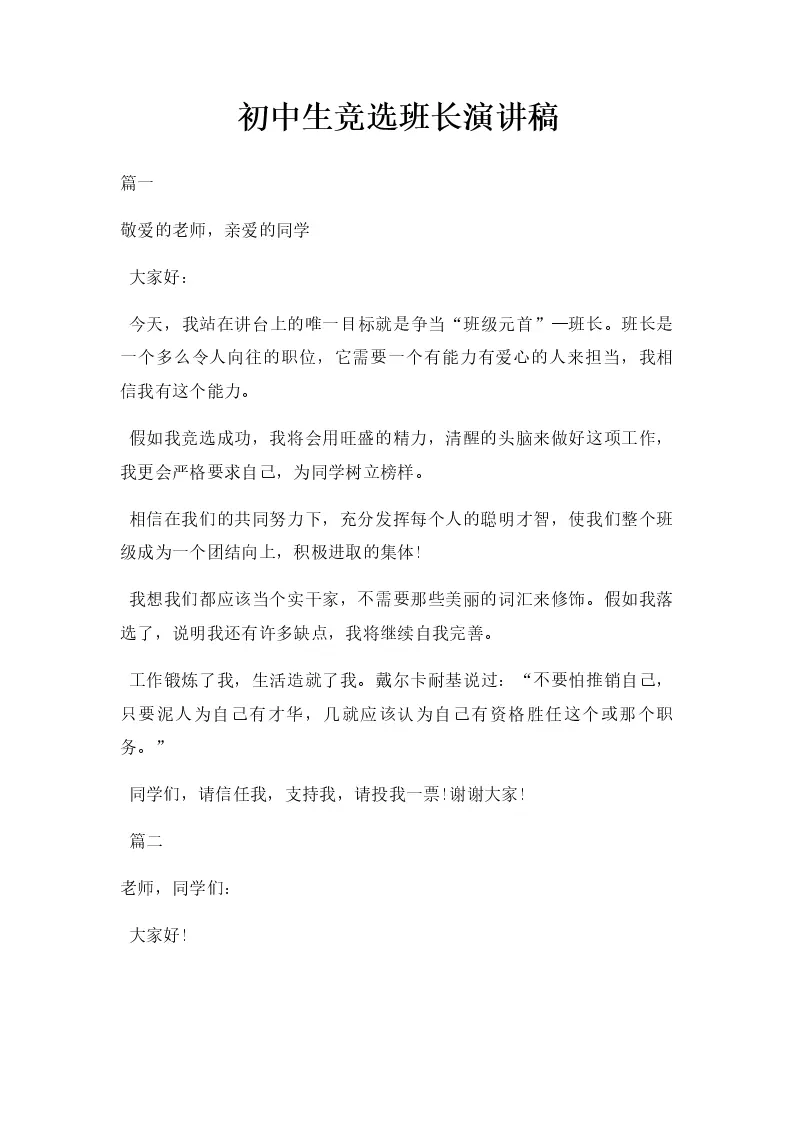 初中生竞选班长演讲稿