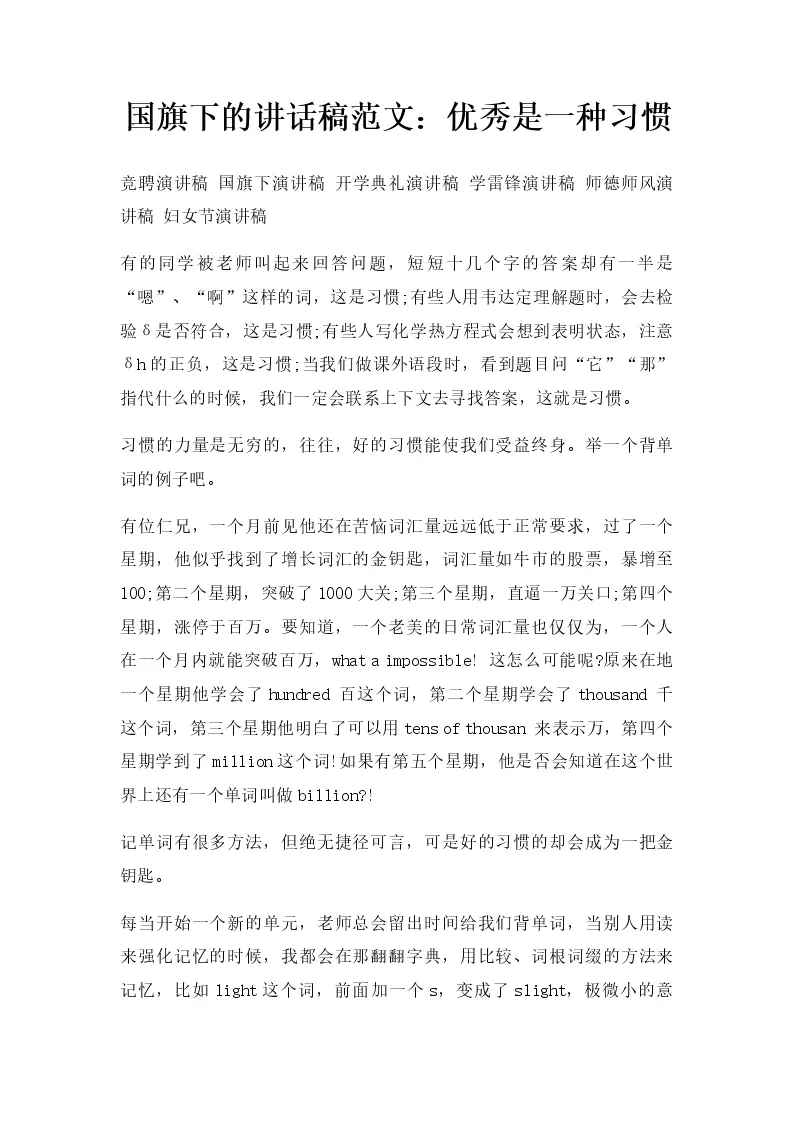 国旗下的讲话稿范文:优秀是一种习惯