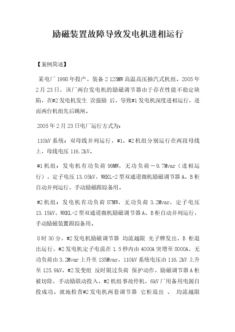 励磁装置故障导致发电机进相运行