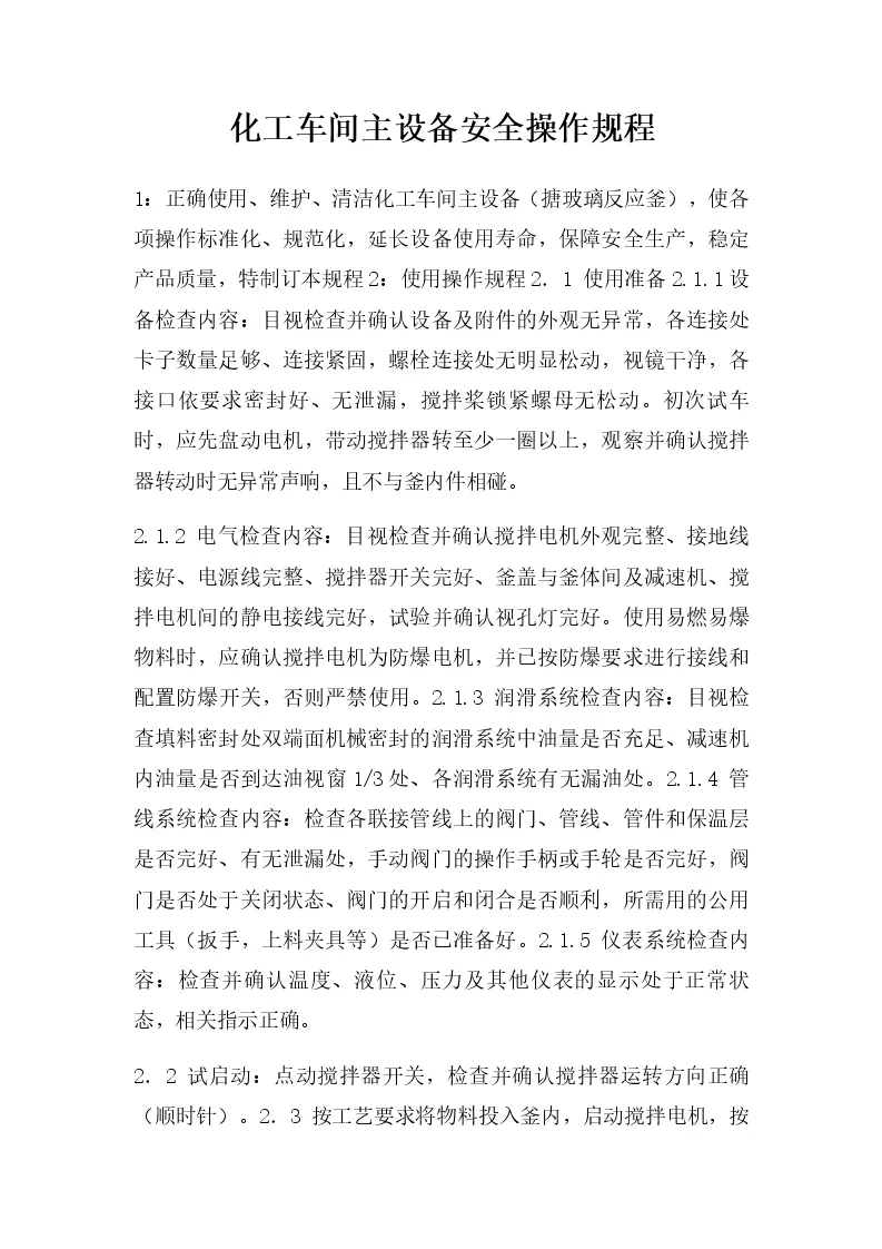 化工车间主设备安全操作规程