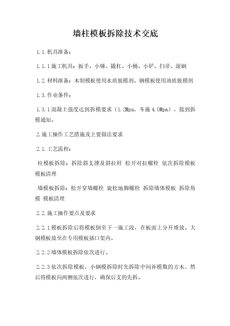 墙柱模板拆除技术交底