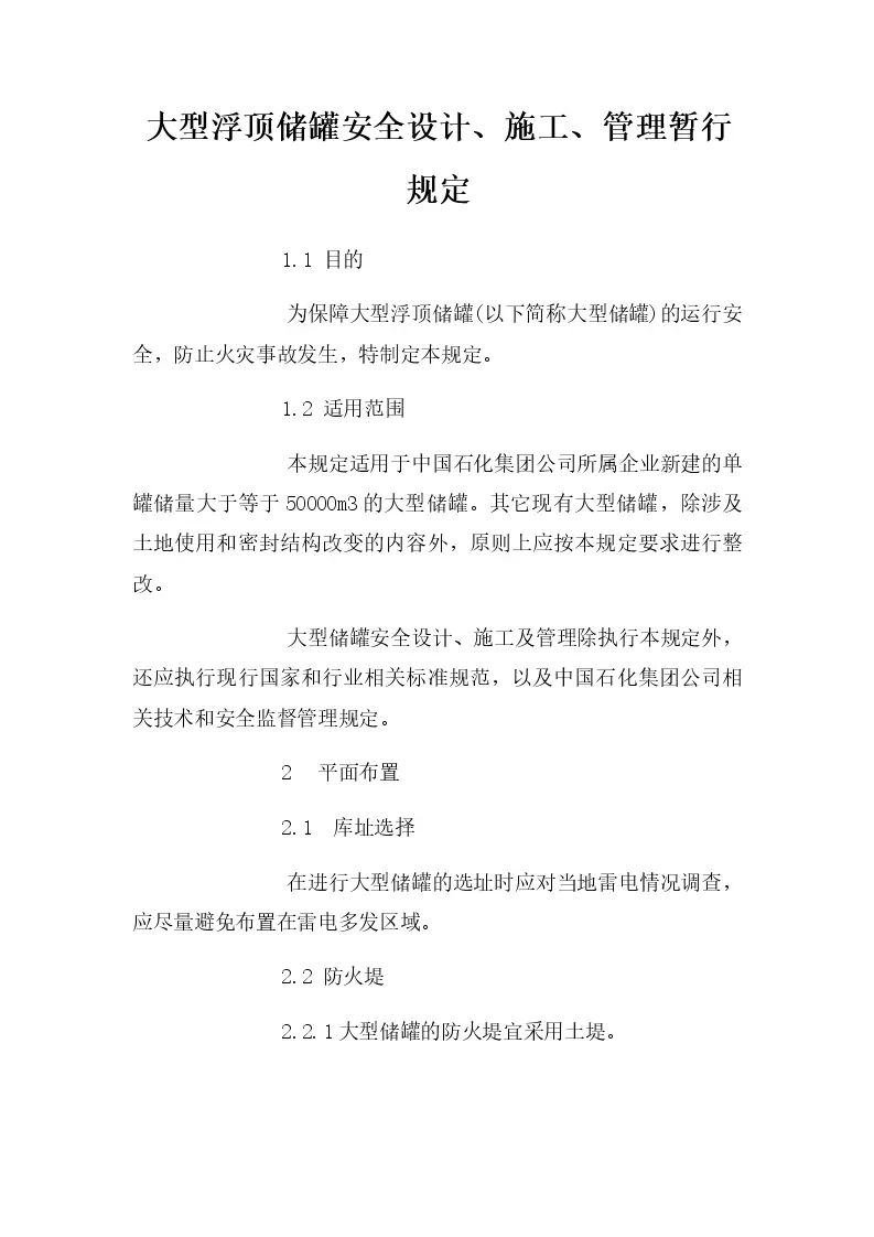 大型浮顶储罐安全设计、施工、管理暂行规定