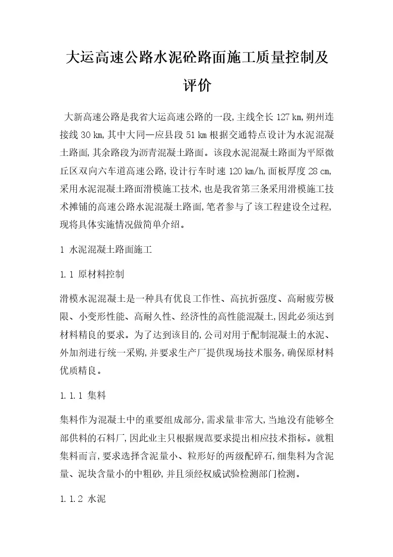 大运高速公路水泥砼路面施工质量控制及评价