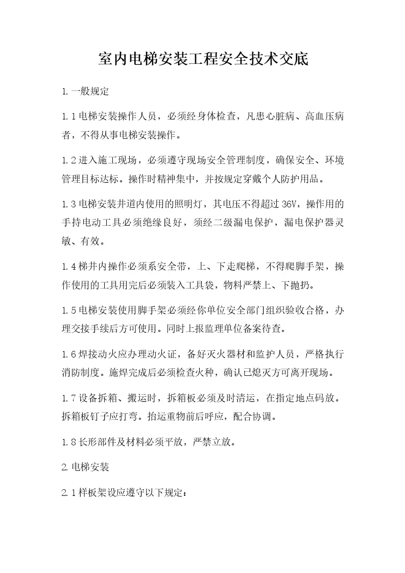 室内电梯安装工程安全技术交底