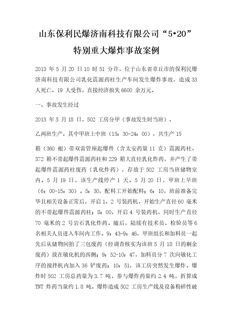 山东保利民爆济南科技有限公司“5•20”特别重大爆炸事故案例
