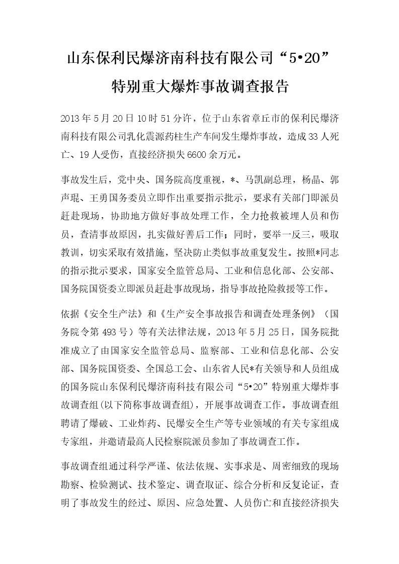 山东保利民爆济南科技有限公司“5•20”特别重大爆炸事故调查报告