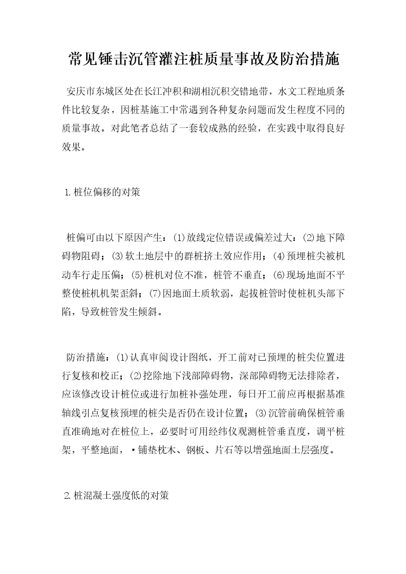 常见锤击沉管灌注桩质量事故及防治措施