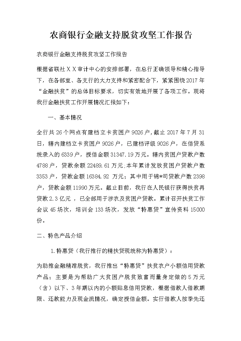 农商银行金融支持脱贫攻坚工作报告
