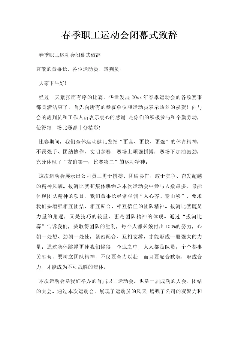 春季职工运动会闭幕式致辞