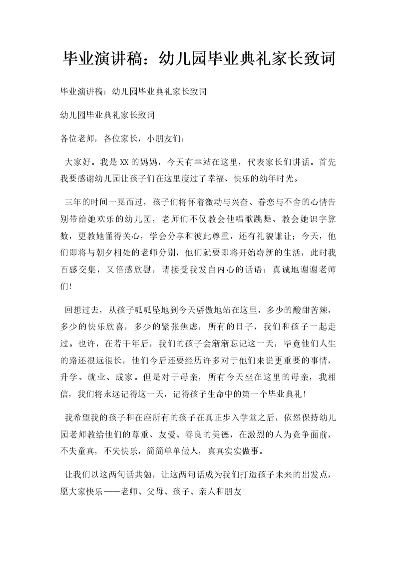 毕业演讲稿:幼儿园毕业典礼家长致词