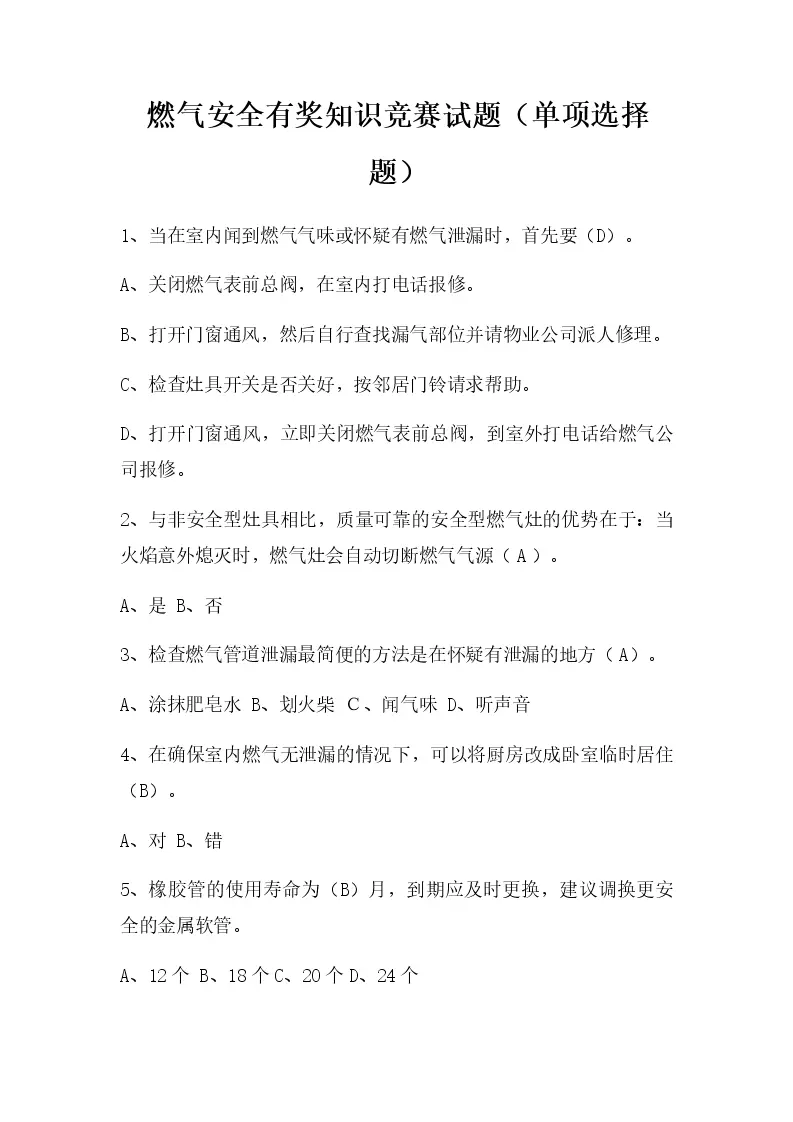燃气安全有奖知识竞赛试题(单项选择题)