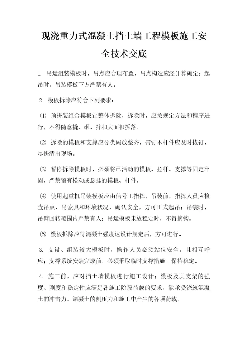 现浇重力式混凝土挡土墙工程模板施工安全技术交底