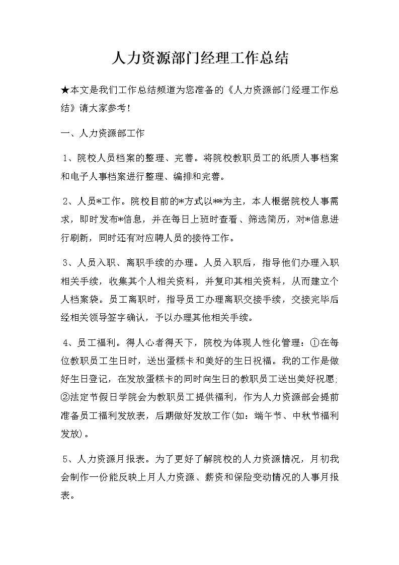 人力资源部门经理工作总结