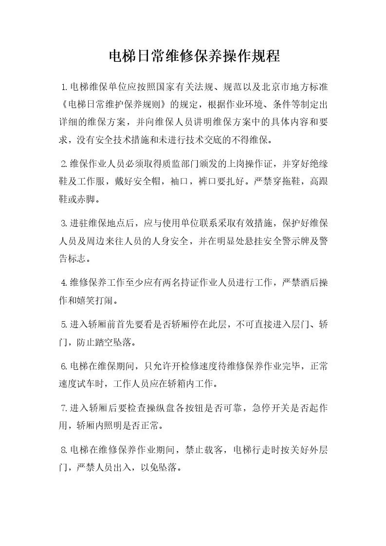 电梯日常维修保养操作规程