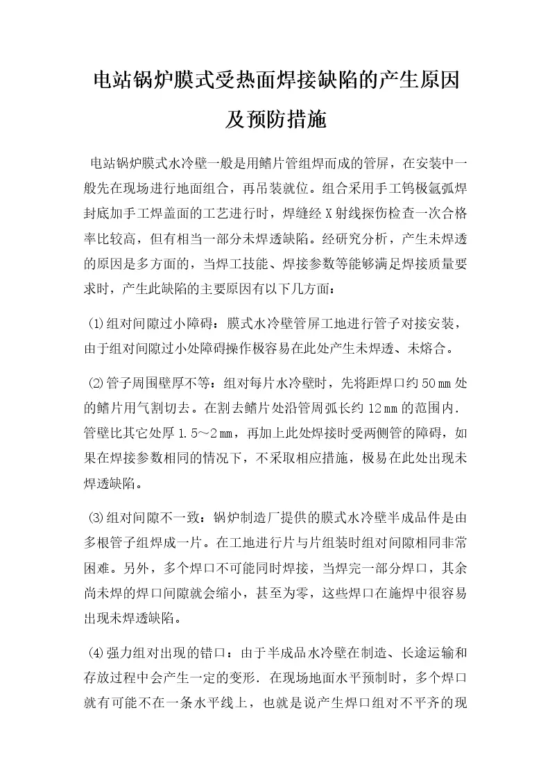 电站锅炉膜式受热面焊接缺陷的产生原因及预防措施