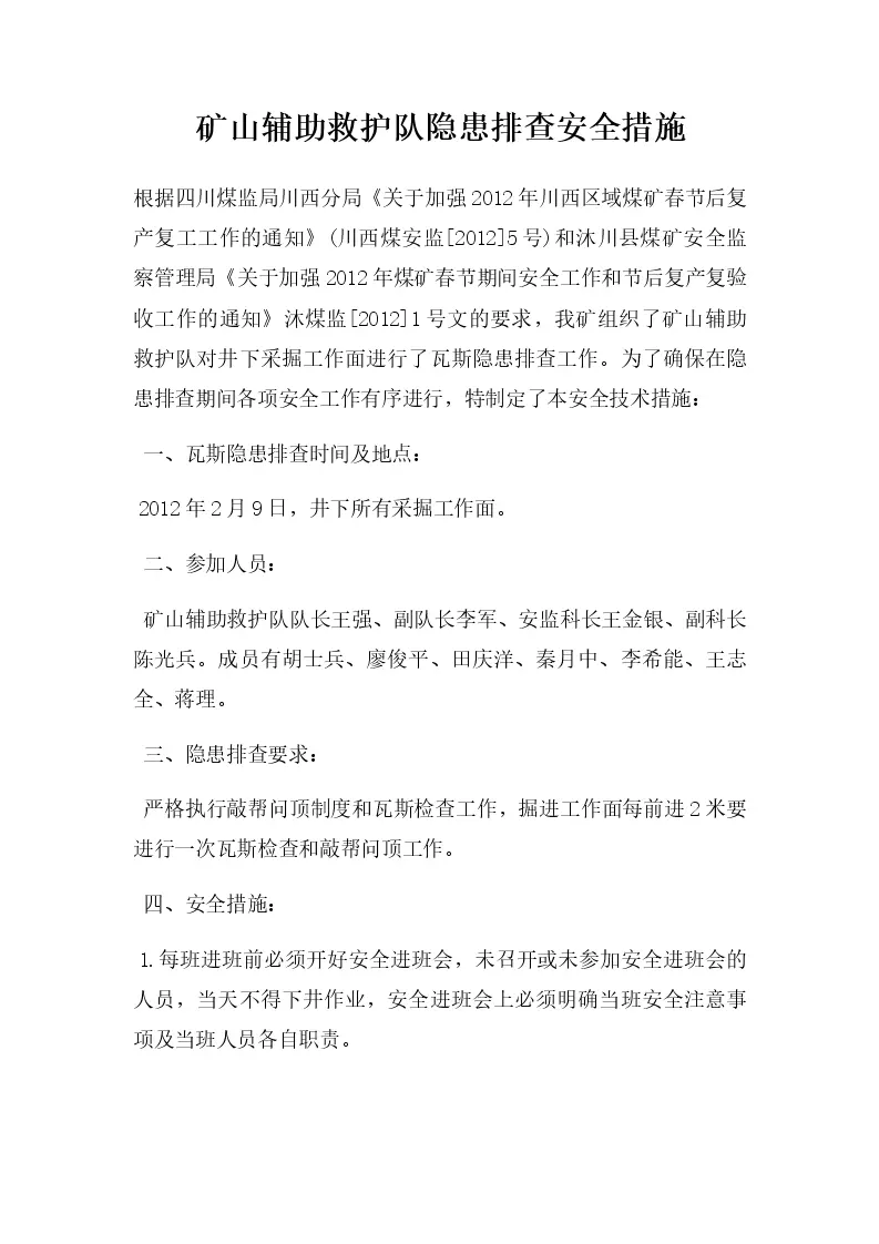 矿山辅助救护队隐患排查安全措施