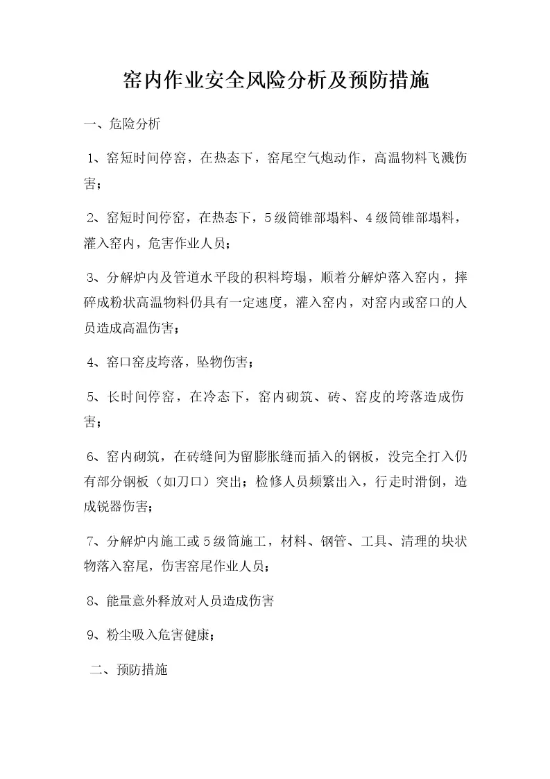 窑内作业安全风险分析及预防措施